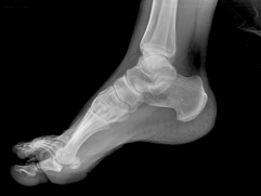 Paciente en BIPEDESTACION O CARGA lateral, apoyando la cara lateral del pie sobre el cassete. El haz de rayos es dirigido verticalmente al centro del tarso.El casette en nuestro caso se coloca en el bucky y el paciente en un escalon.